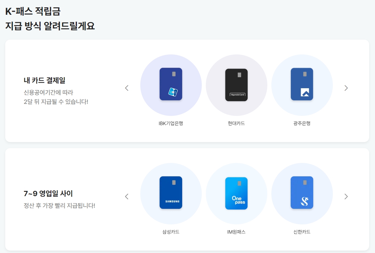 K-패스와 연계된 각 카드사들은 대중교통 이용 실적에 따라 다양한 추가 혜택을 제공하고 있어요. 각 카드별로 제공되는 대표적인 추가 혜택을 소개해드립니다